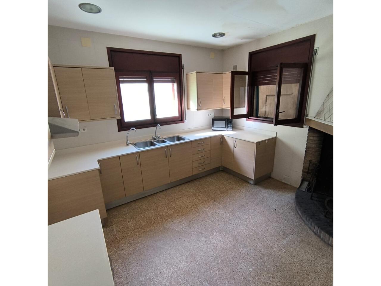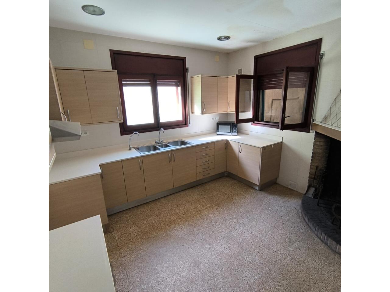 La vivienda dispone de todas las comodidades: un espacioso garaje con capacidad para cuatro o más vehículos, terraza soleada, patio interior y hasta tres cocinas distribuidas entre las dos plantas. En la planta baja encontramos cuatro amplias habitaciones dobles, dos baños completos, una cocina independiente y un salón muy luminoso con salida directa al patio interior. En la planta superior se ubican otras cuatro habitaciones dobles, un baño, una cocina adicional y un balcón con vistas.